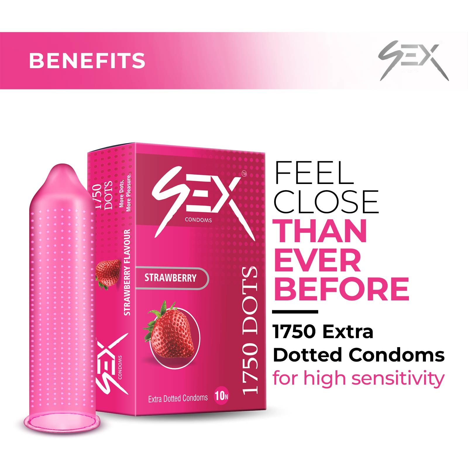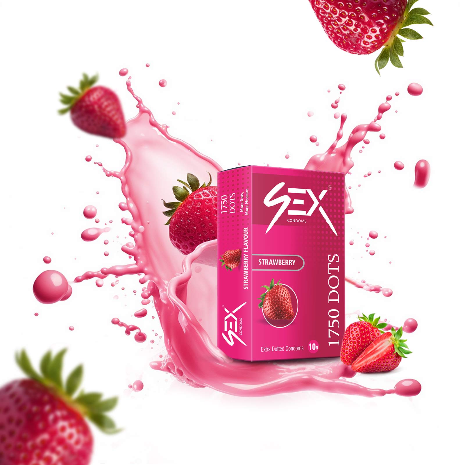 4EX Condoms 1750 Dots (Strawberry Flavor,10 Condoms Per Pack) are designed to enhance intimacy with a perfect combination of taste and texture. Each high-quality latex condom is covered with 1750 raised dots for maximum stimulation. Infused with a delicious natural strawberry flavor, these condoms provide a sweet and sensual experience. Pre-lubricated and electronically tested for safety, comfort, and reliability, they let you focus on pure pleasure with confidence.