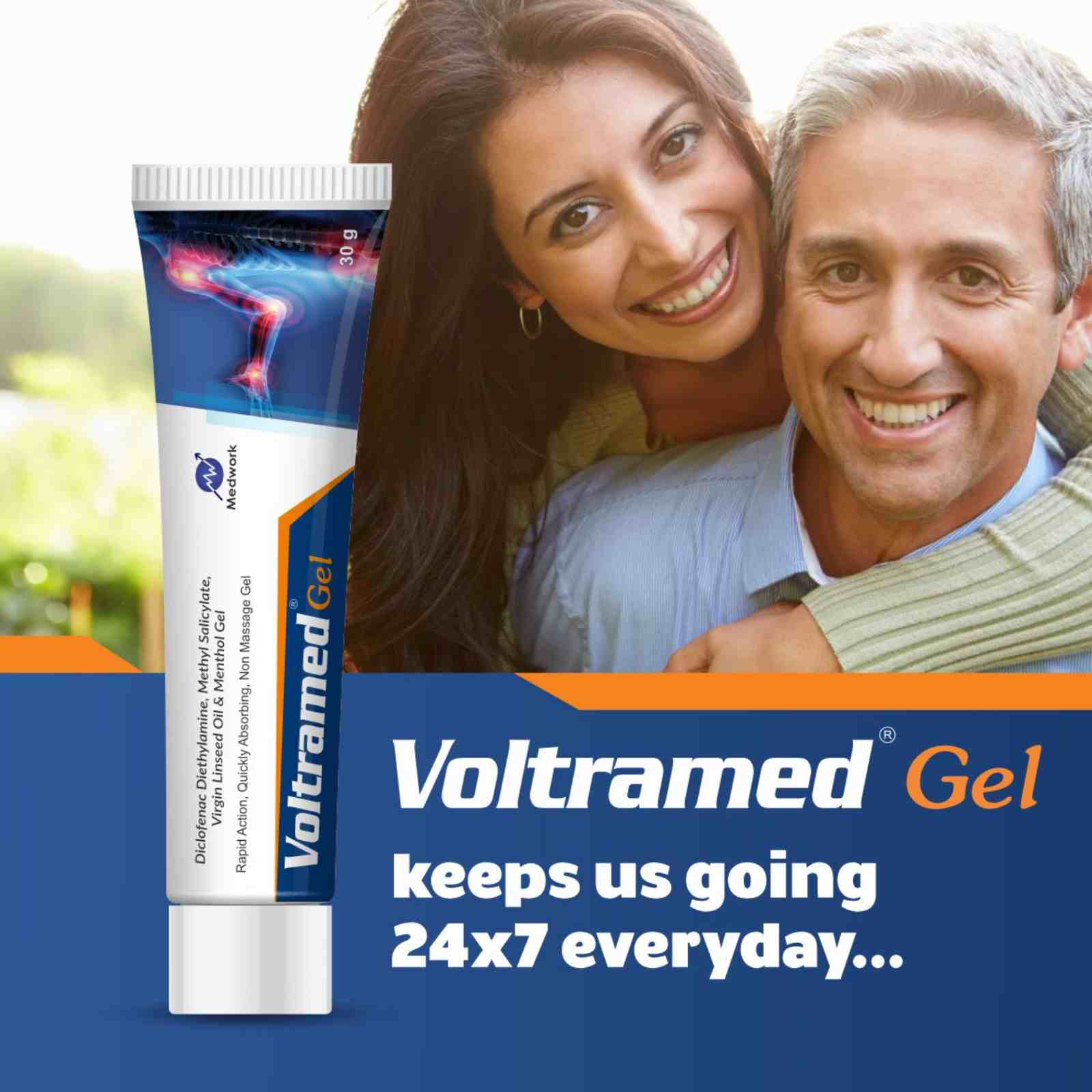 30gm Diclofenac Diethylamine 1.16% w/w, Virgin Linseed Oil 3.00% w/w, Methyl Salicylate 10.00% w/w, Menthol 5.00% w/w, Benzyl Alcohol (as a preservative) 1.00% w/w